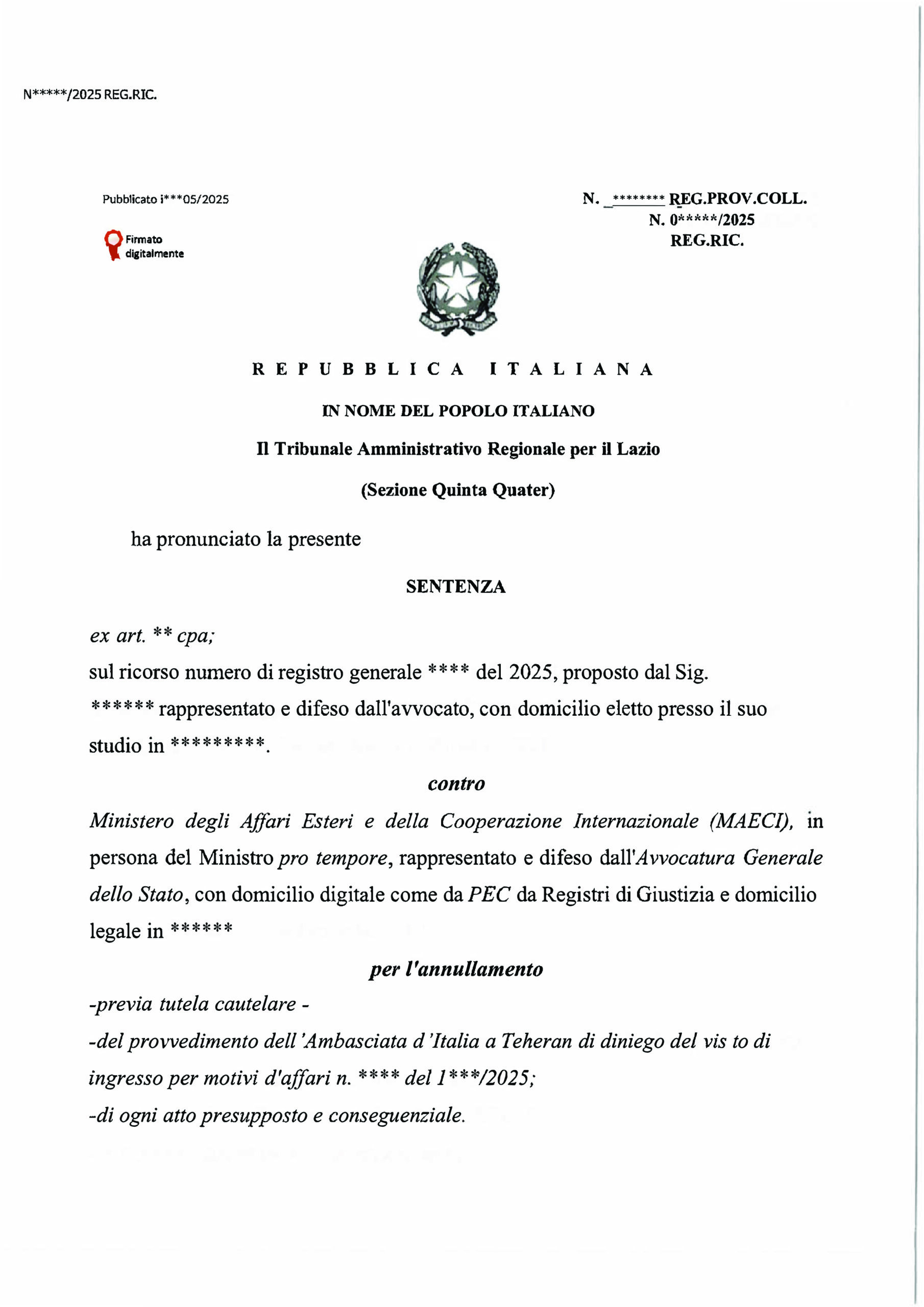 La presente società fornisce esclusivamente consulenze gratuite in merito alle procedure di ricorso contro il diniego del visto per l’Italia.